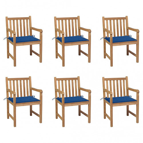 vidaXL havestole 6 stk. med kongeblå hynder massivt teaktræ