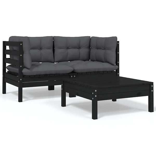 vidaXL Loungegrupp med dynor svart 3 delar massiv furu 806680