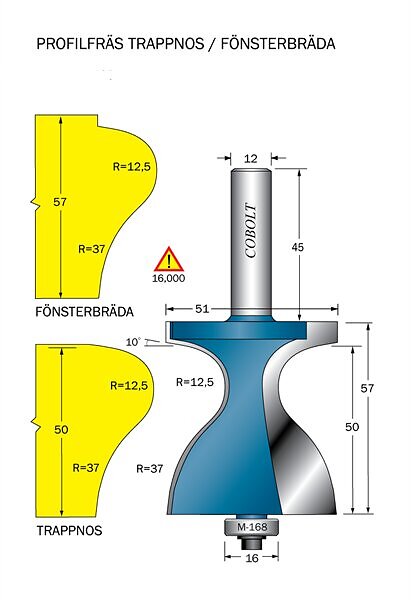 Cobolt Fräs Trappnos Fönsterbräda D=51 R=12.5 R=37 TL=57 S=12