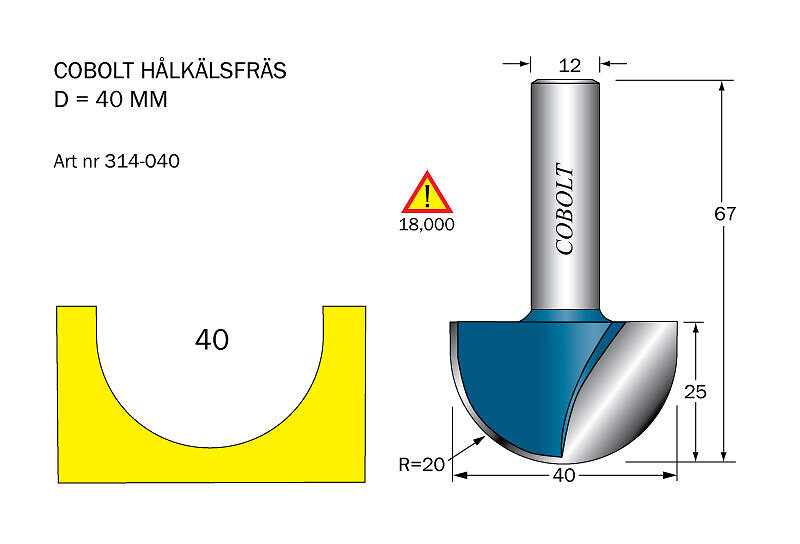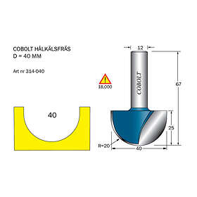 Cobolt Hålkälsfräs D=40l=25 TL=68 R=20 S=12