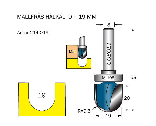 Cobolt Mallfräs hålkäl D=19l=20 S=8 R=9.5