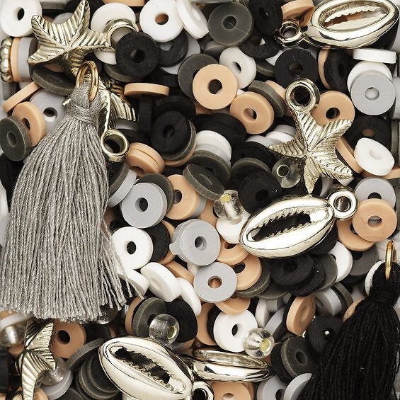 Diverse Pärlmix med platta pärlor heishi-pärlor Ø6 mm och tillbehör – beige & svart tema