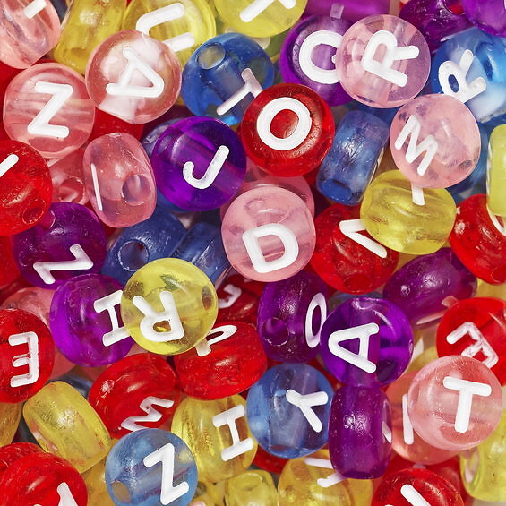 Panduro Hobby 500 färgglada bokstavspärlor, transparenta med vit text, A-Z, Ø7 mm