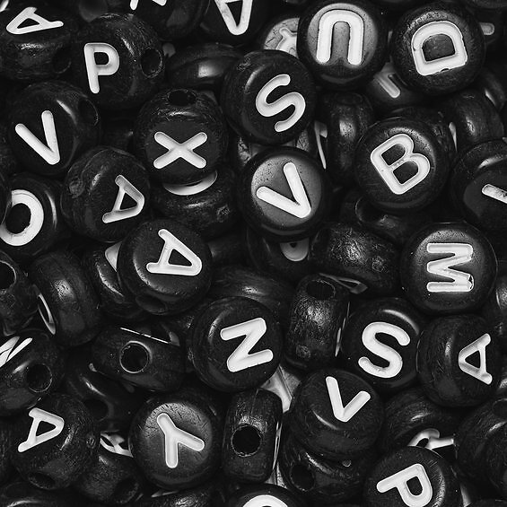 Panduro Hobby 500 svarta bokstavspärlor med vit text, A-Z, Ø7 mm