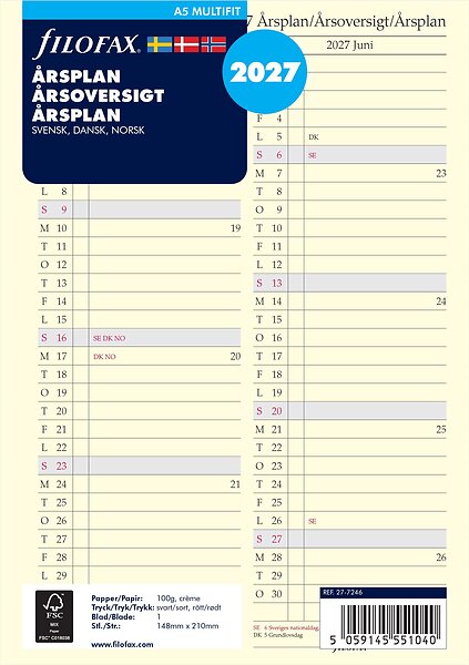 Filofax 2027 Refill, A5, Årsplan