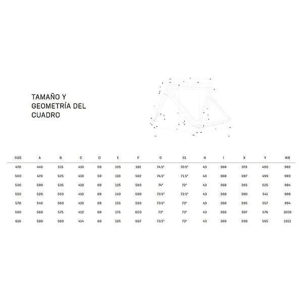 47 cm, 50 cm, 55 cm, 59 cm, 53 cm, 57 cm, 61 cm