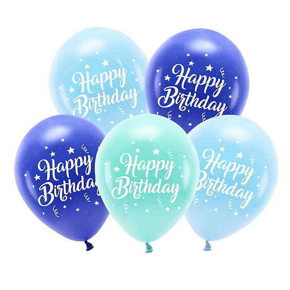 PartyDeco Latexballonger 5-pack Ø26 cm – blått tema med texten Happy Birthday