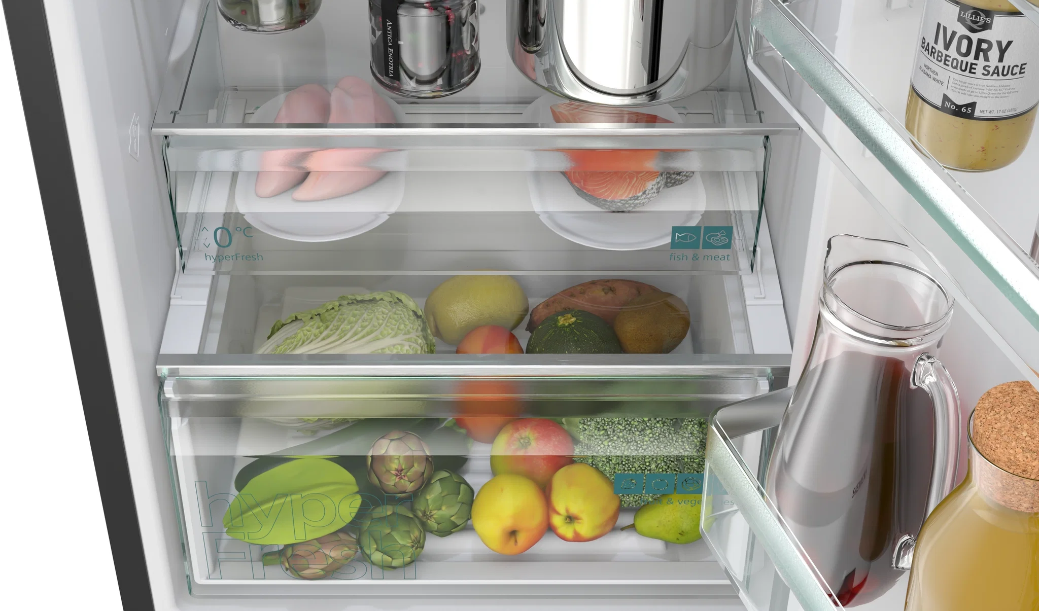 Hurtig køling, Isdispenser, Indbygget skærm, Hurtig nedfrysning, Flaskeholder, Isbakke, Justerbar temperaturzone, Indbygget LED-belysning, Frostfrit køleskab, Frostfri fryser