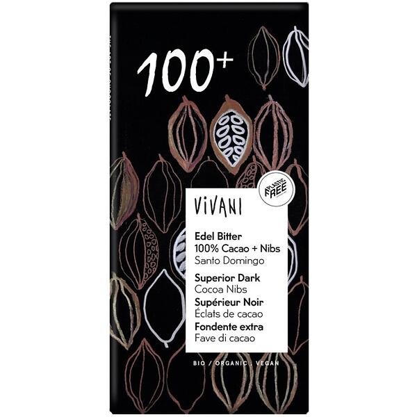 Vivani Mørk chokolade 100% med kakaonibs 80g