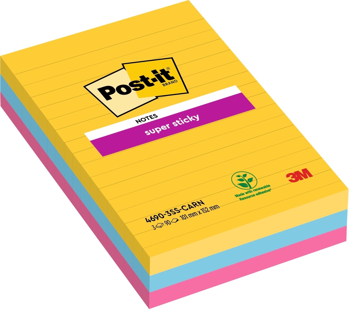 3M Post-it Super Sticky 101 x 152 mm Farvemix Linjeret 3-pak