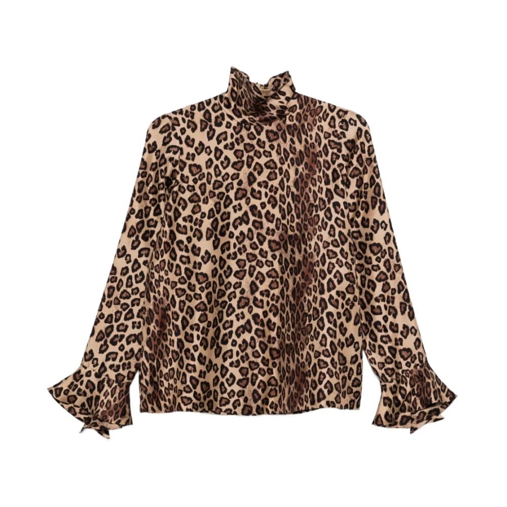 Alberto Biani, Bluser og skjorter , Dame, Brun, 2XS, Leopard Print Silke High Neck Skjorte
