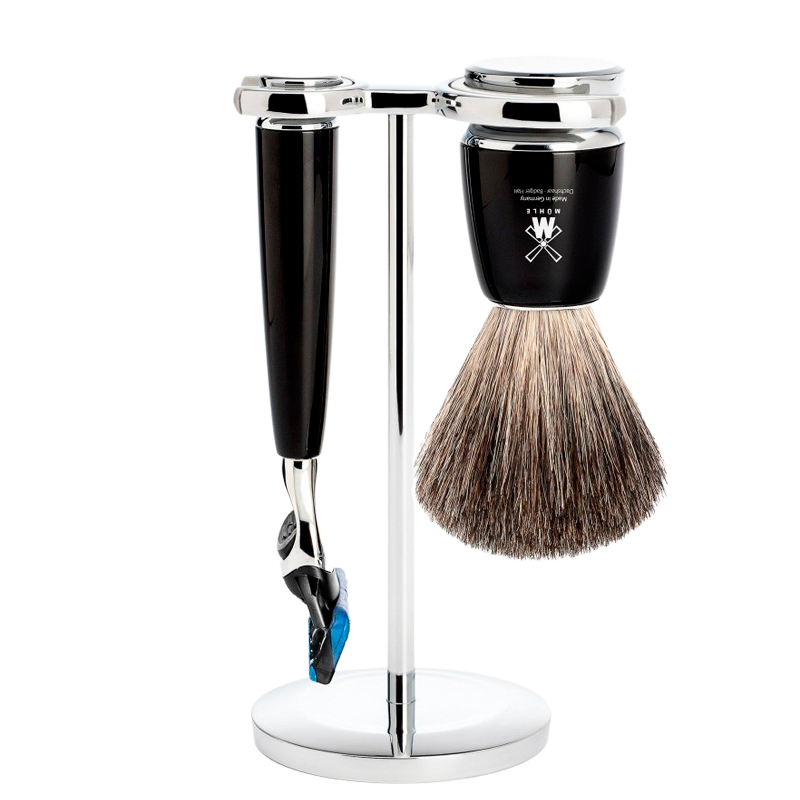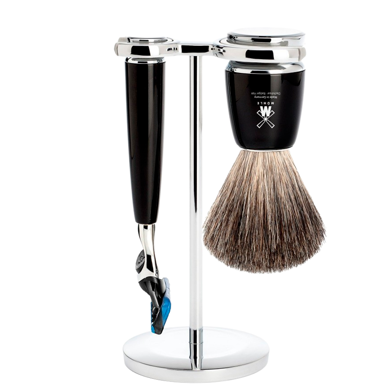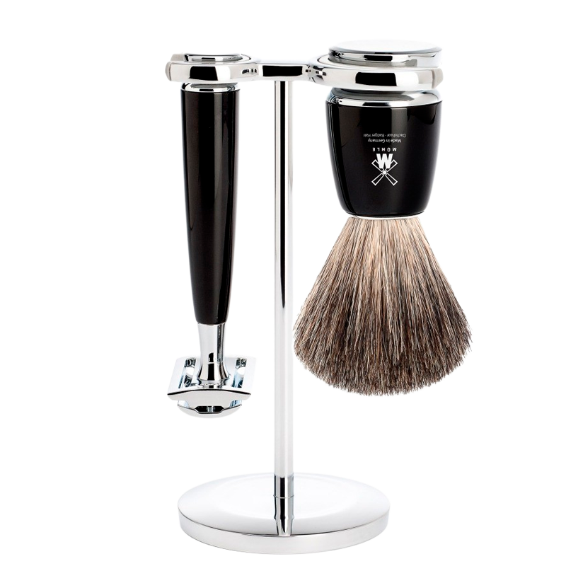 Mühle Barbersæt: DE-Skraber, Pure Badger Barberkost og Holder, Rytmo, Sort Resin (1 sæt)
