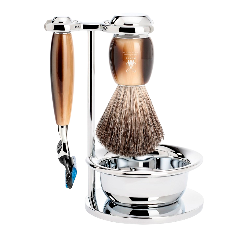 Mühle Barbersæt: Fusion Skaber, Pure Badger Barberkost, Holder og Skål, Vivo, Horn (1 sæt)