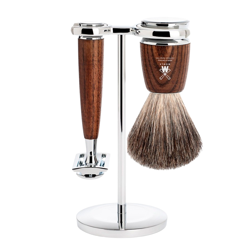 Mühle Barbersæt: DE-Skraber, Pure Badger Barberkost og Holder, Rytmo, Ask (1 sæt)