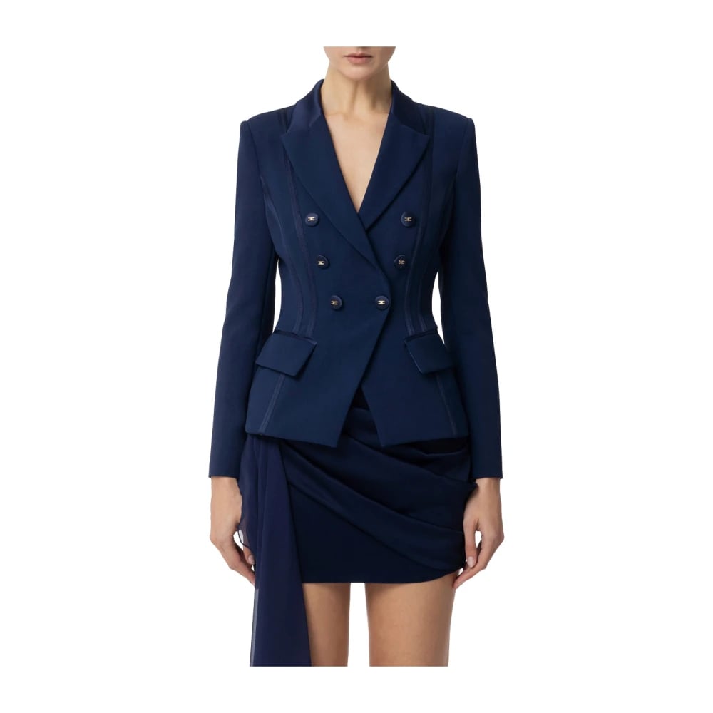 Elisabetta Franchi, Jakker , Dame, Blå, XL, Satin, Double-Breasted Blå Blazer med Satin Detaljer