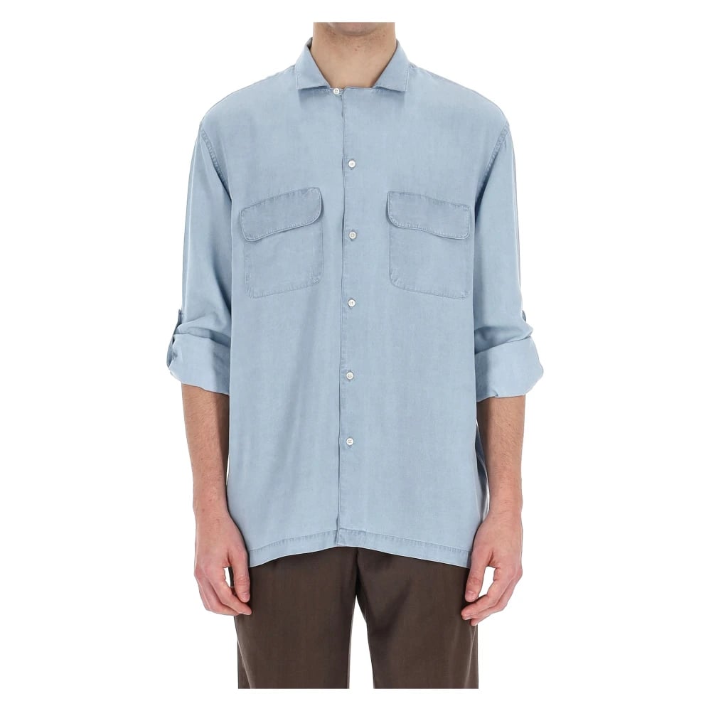 Eleventy, Skjorter , Herre, Blå, XL, Denim, Point-Collar Lyocell-Linen Skjorte