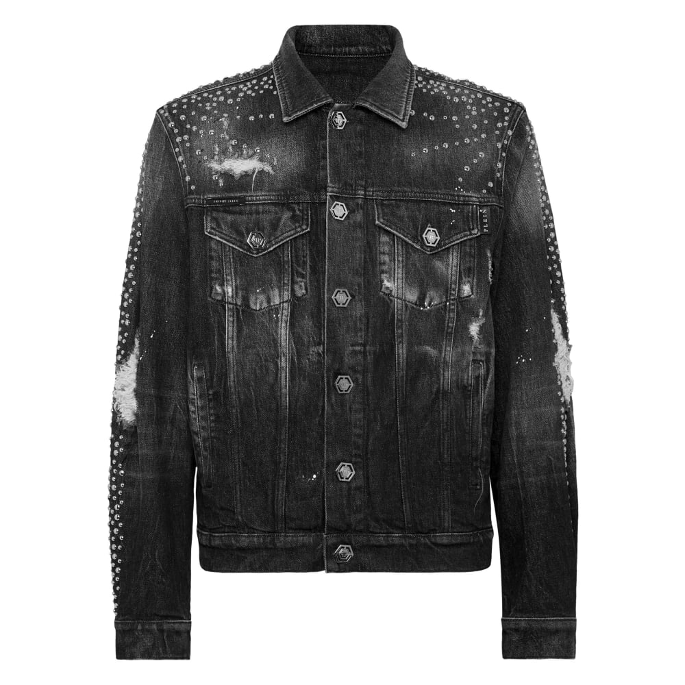 Philipp Plein, Jakker , Herre, Grå, 3XL, Denim, Denim Trucker Jacket LS Studs