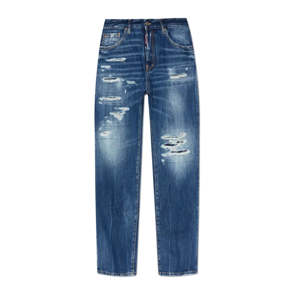 Dsquared2, Jeans , Dame, Blå, 2XS, Denim, Tattered Cotton Mid Waist Straight Denim Jeans