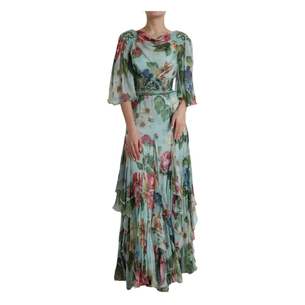 Dolce & Gabbana, Kjoler , Dame, Flerfarvet, M, Bomuld, Silk Floral Crystal Long Maxi Dress