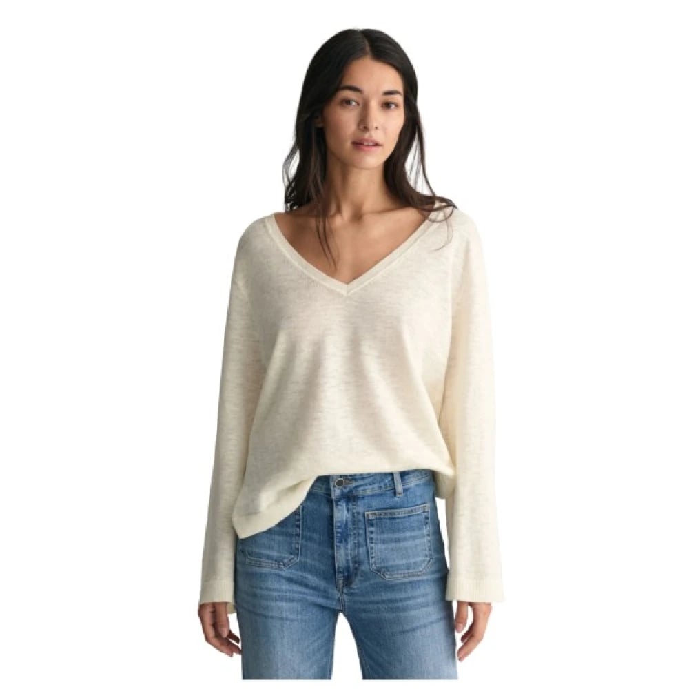 Gant, Strik , Dame, Beige, S, Linned, V-hals Linned Blandet Afslappet Sweater