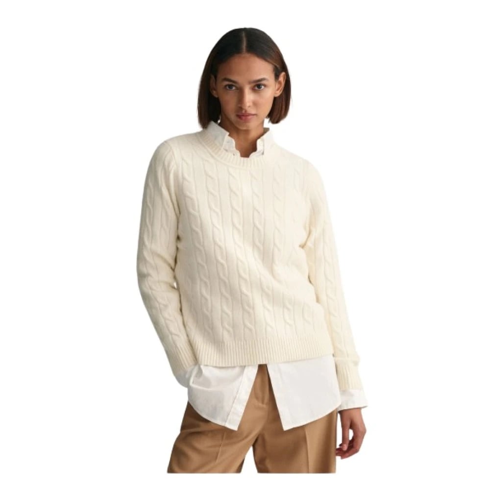 Gant, Strik , Dame, Beige, S, Bomuld, Rundhalset kabelstrikket sweater