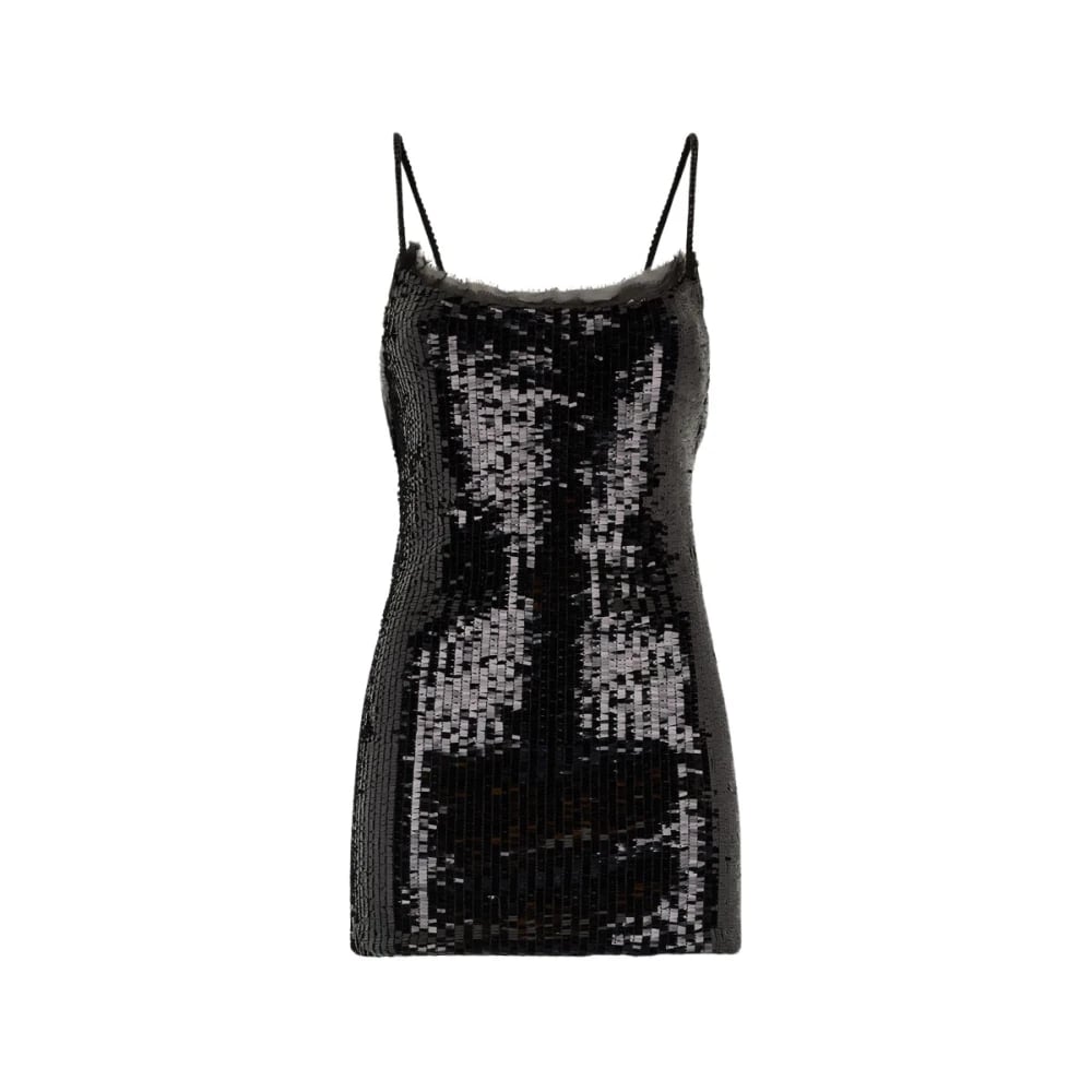 Roberto Cavalli, Kjoler , Dame, Sort, M, Polyester, Glitrende Minikjole med Åben Ryg og Gennemsigtige Flæser