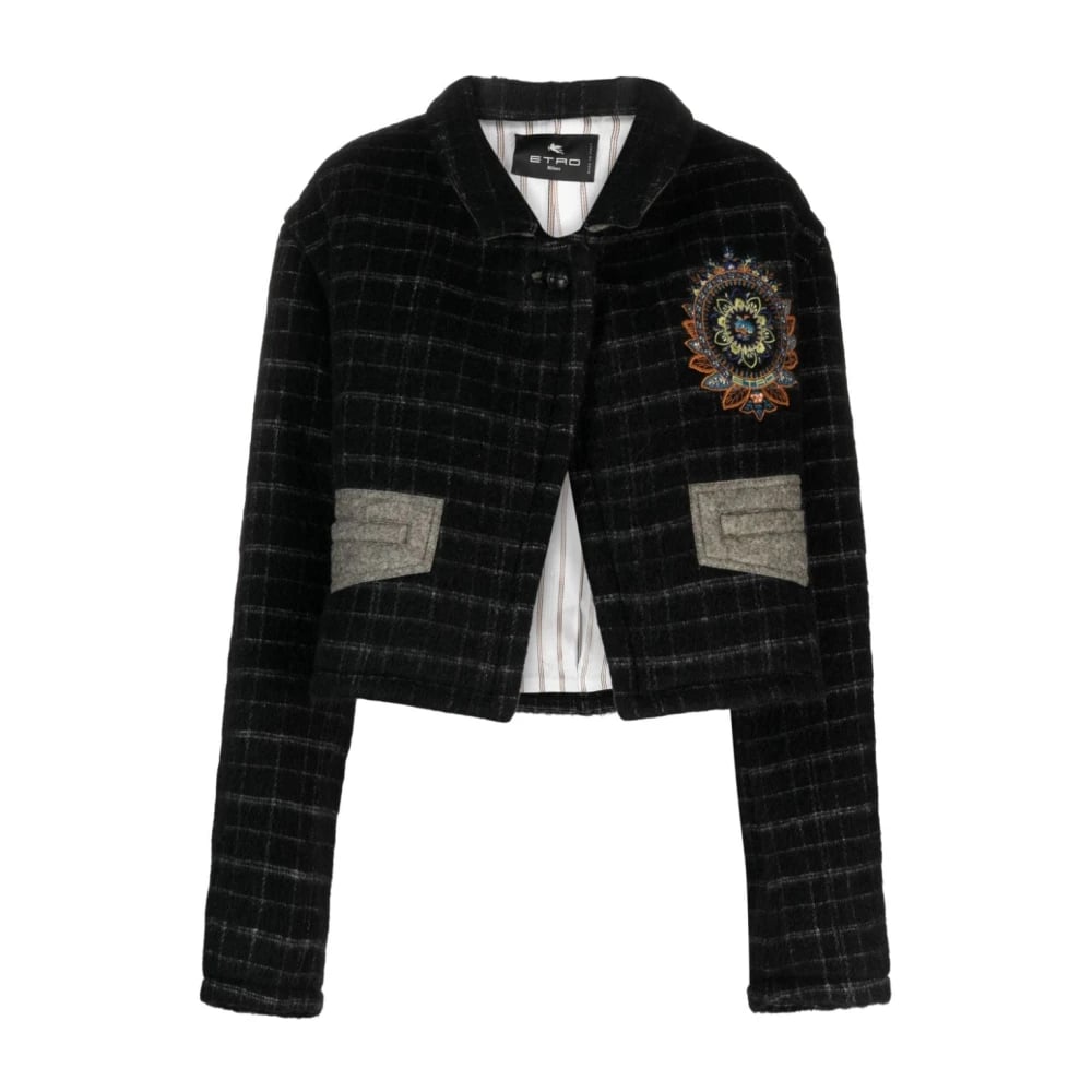 Etro, Jakker , Dame, Sort, XS, Uld, Sort Jakke med Ternet Mønster og Blomsterbroderi