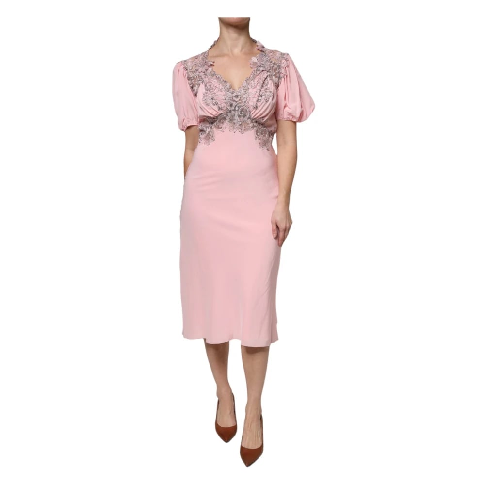 Ermanno Scervino, Kjoler , Dame, Lyserød, L, Polyester, Blomstret blonde midi-kjole med korte ærmer og V-hals