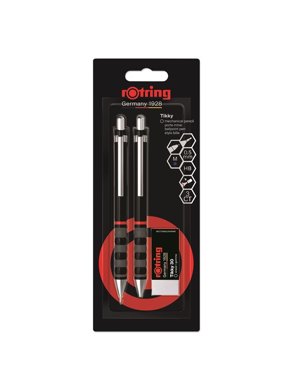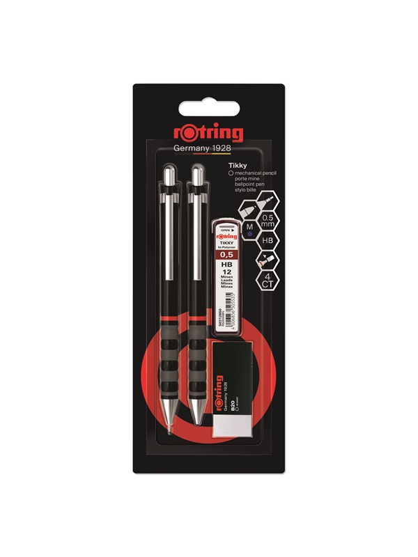 Rotring rOtring Tikky Mekanisk Blyant, Kuglepen, Viskelæder & Blyrefiller Sæt | HB Bly, 0,5 mm Blyant | Medium spids pen | Sort Skaft