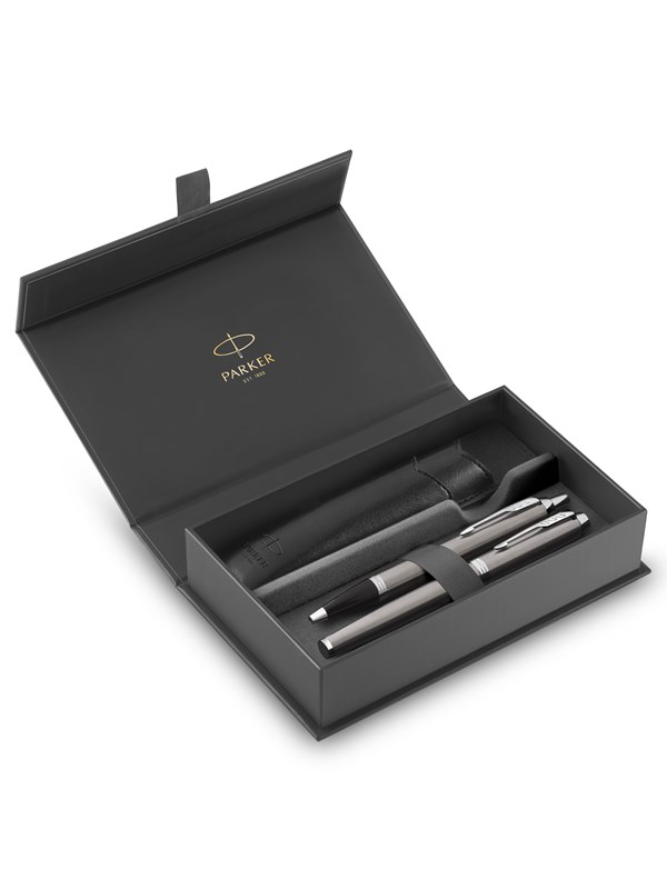 Parker IM Duo Pen Gavesæt | Fyldepen, kuglepen & penneetui | Sort lakeret finish med krombeklædning | Medium spids