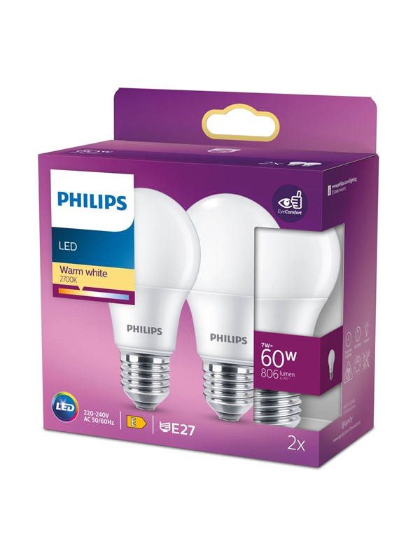 Philips LED pære A60 Standard 7W/827 (60W) mat 2-pak E27