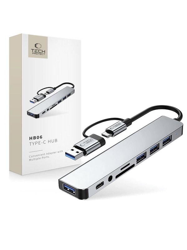 Tech-Protect HB06 HUB Adapter 8in1 TYPE-C + USB2.0 + USB3.0 + SD/TF + AV3.5 - Grey USB hub - USB 2.0 - 8 ports - Grå