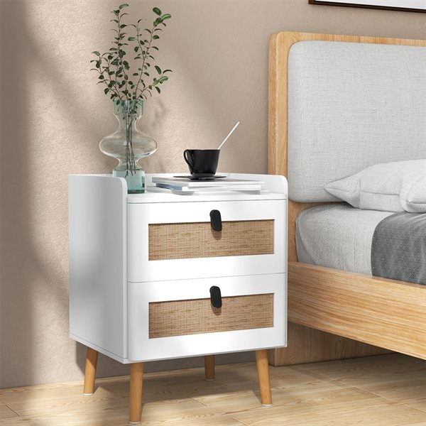 Sengebord med 2 skuffer - Hvid/Rattan