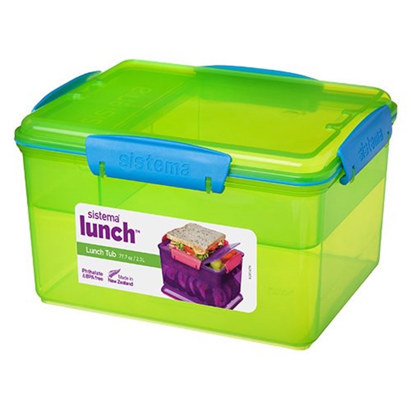 Madkasse stor lunch tub 2,3 L 4 rum, lime, blå, pink og lilla Sistema