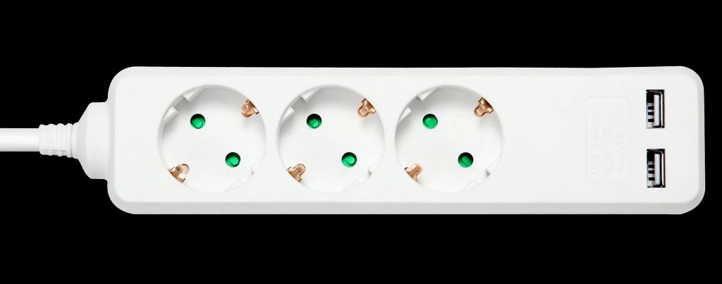 Hvid jordet forlængerledning med 2x USB-A og 3 stikkontakter, 1,5 m