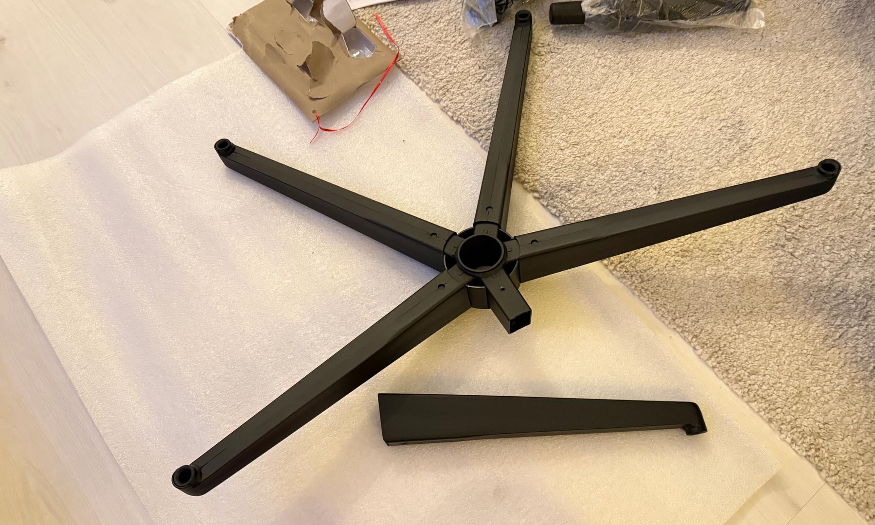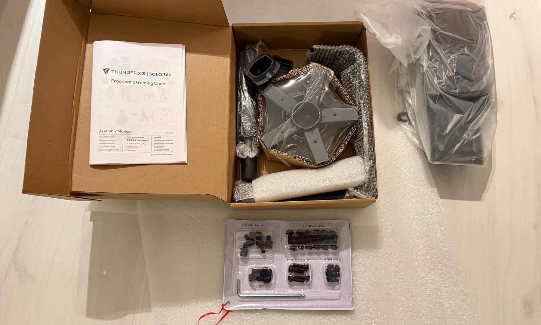 Jeg har samlet en del gamerstole gennem årene og har en rimelig fornemmelse af, hvor kompliceret det behøver at være. Med ThunderX3 SOLO 360 synes jeg monteringsprocessen ikke var superlet. Der er tydelige tegn på, at producenten har gjort det nemt at masseproducere. Der er flere dele og skruer end de lidt dyrere stole. Foden kommer i separate dele i stedet for en støbt fod. Det resulterer i en skrue pr. gren/ben.