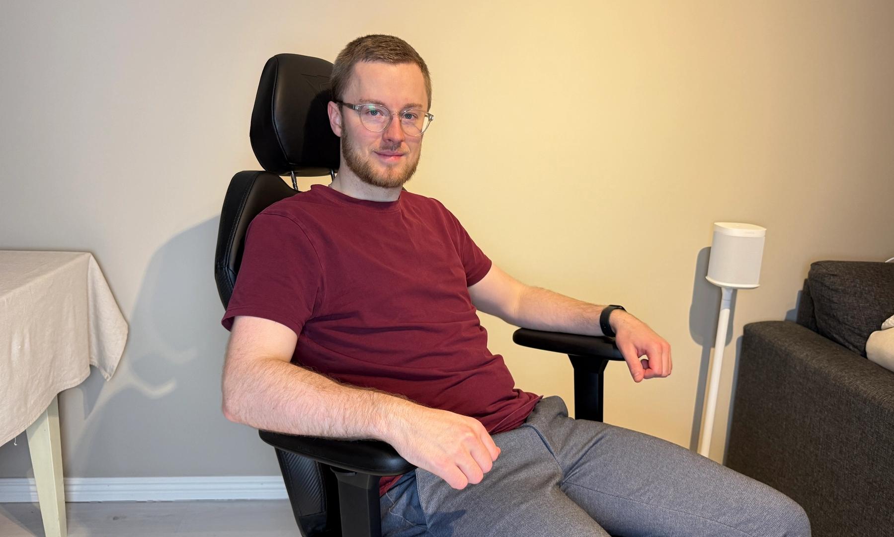 Den første sidetur i stolen giver mig ganske gode vibes. Noget, jeg ofte støder på, er at disse mere prisvenlige stole har for brede armlæn for mig personligt. Jeg justerer armlænene 90°, så de peger ind mod mine ribben omtrent. Det gør, at jeg kommer længere ind mod skrivebordet og aflaster skuldrene, som ellers ret hurtigt bliver trætte.